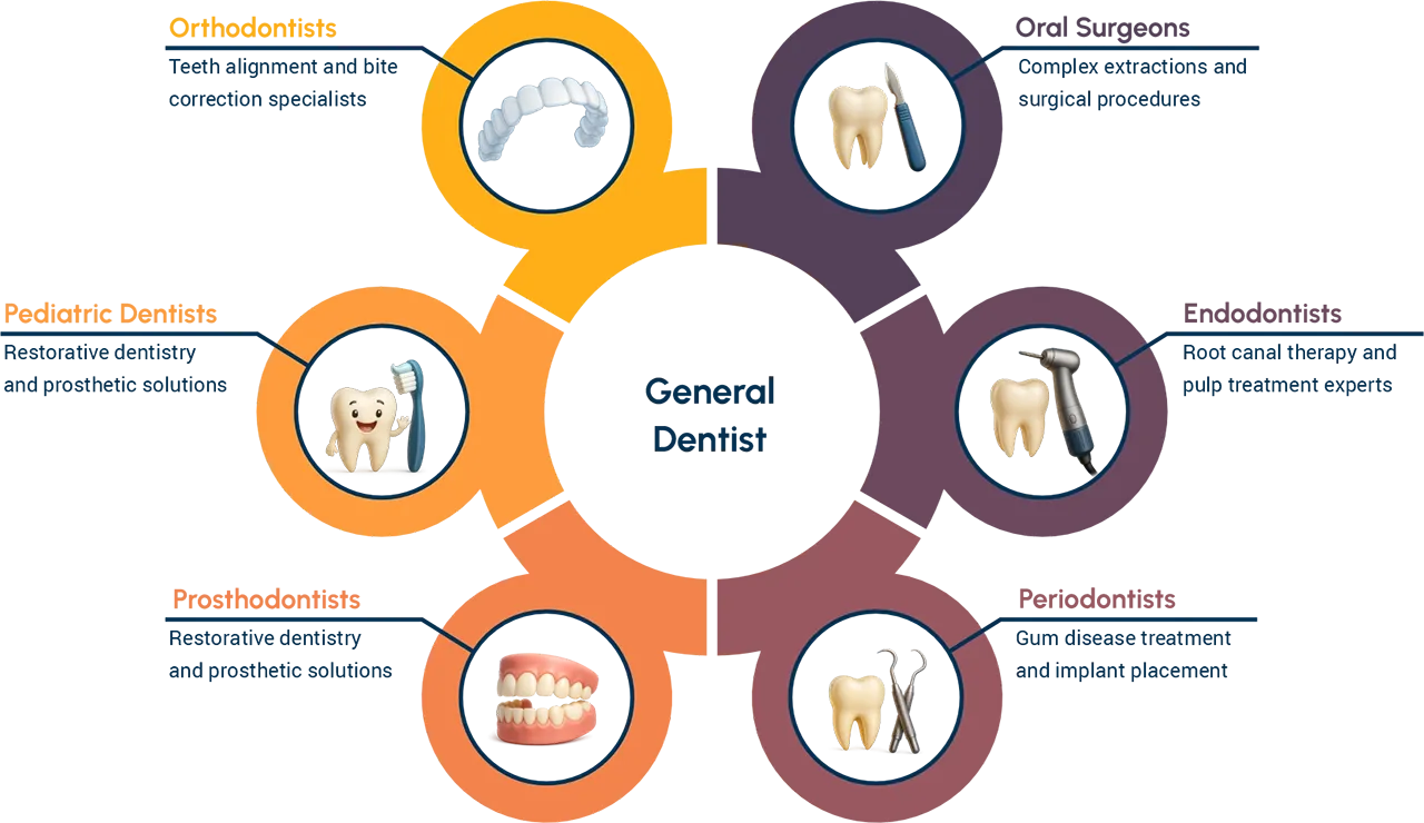 The General Dentist serves as the central hub, orchestrating comprehensive patient care across the entire dental network.